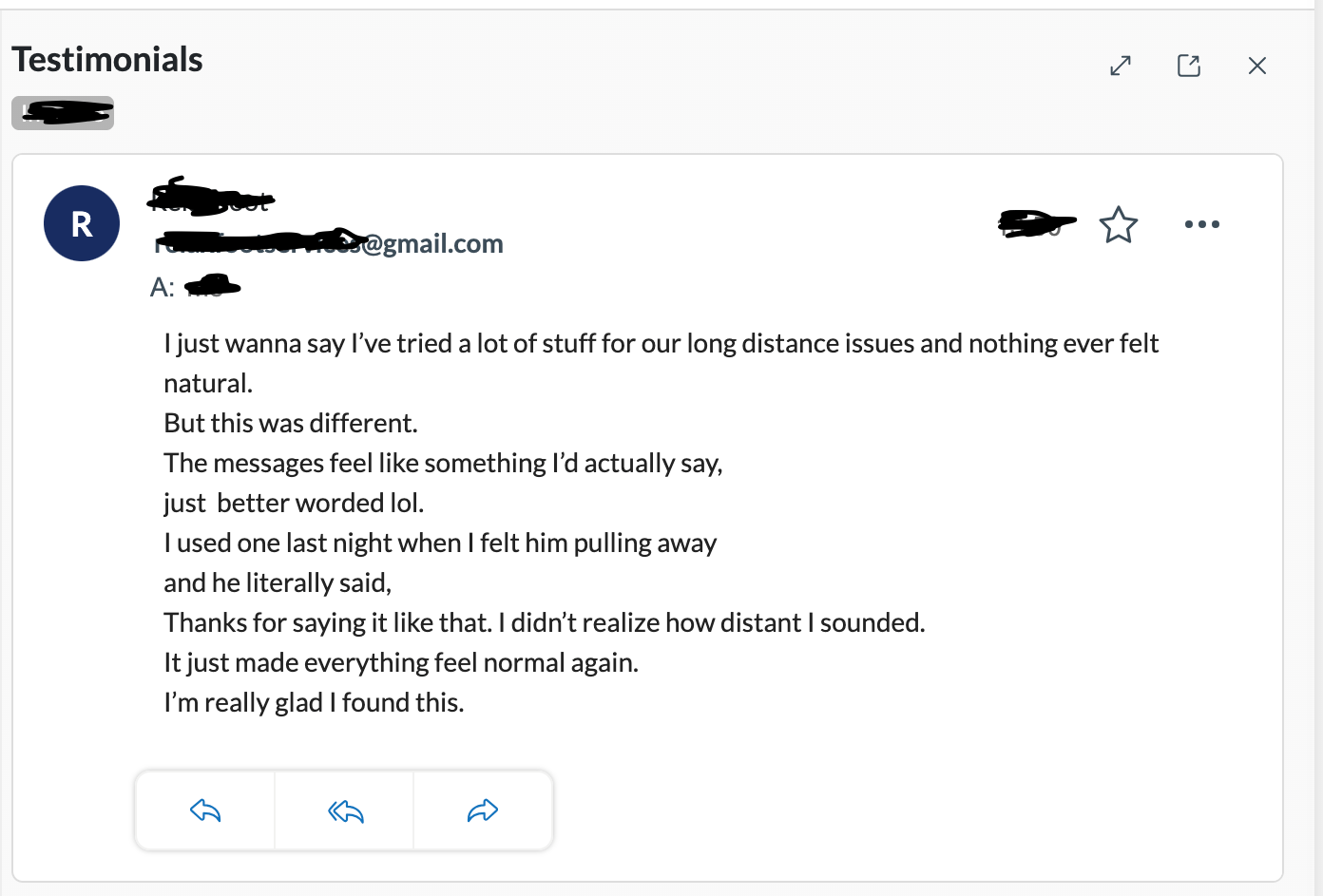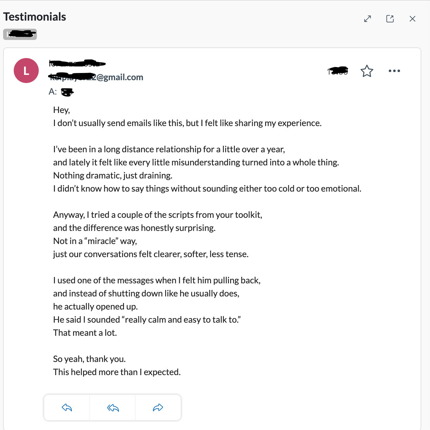 JOIN 1500+ LONG DISTANCE COUPLES WHO DISCOVERED HOW TO STAY CONNECTED AND CLOSE WITHOUT MISUNDERSTANDINGS, WITHOUT DRAMA, AND WITHOUT TURNING SIMPLE TEXTS INTO ARGUMENTS. JUST CLEARER MESSAGES, MORE COMFORT, AND A NATURAL FLOW AGAIN